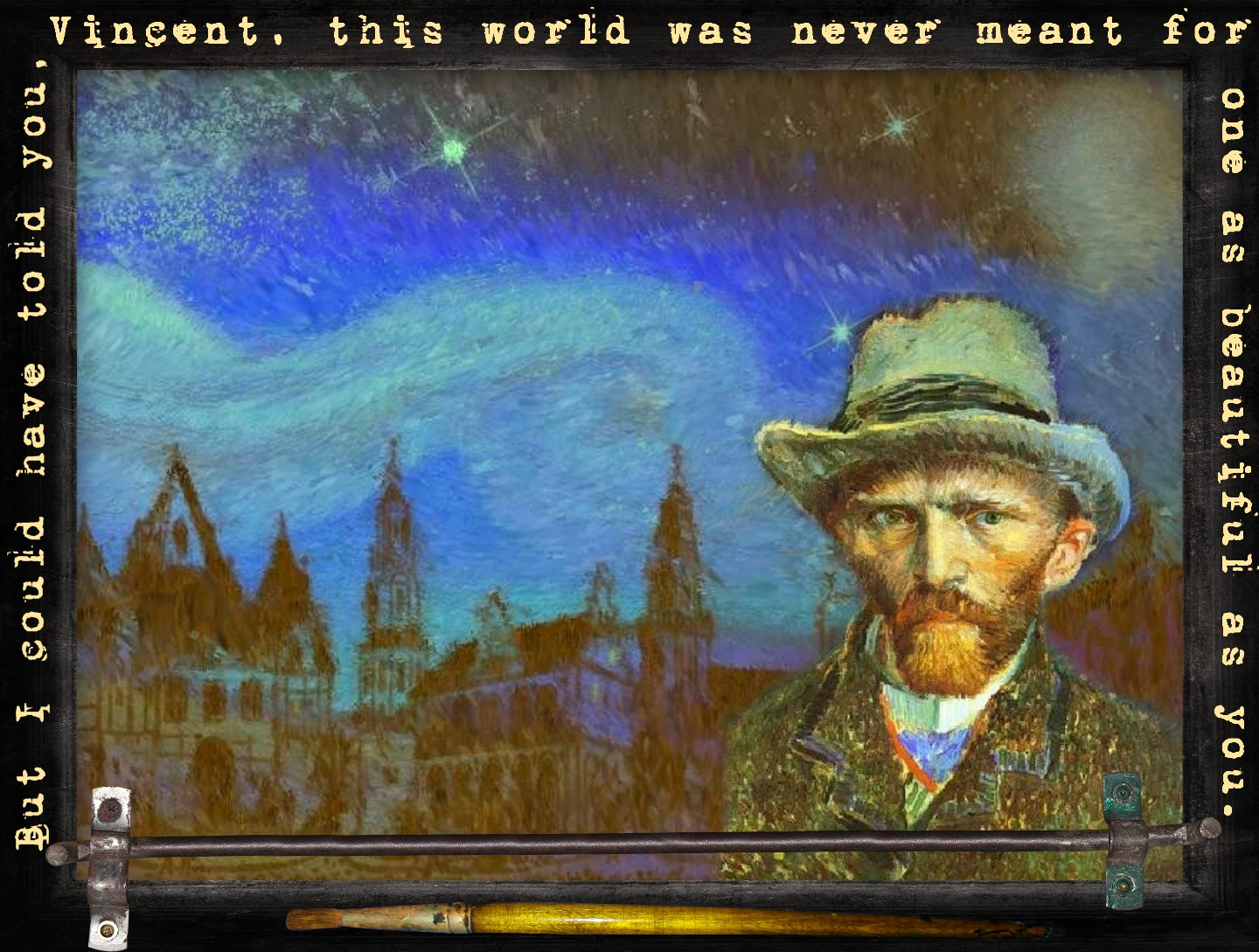 My artist of choice is the great Vincent van Gogh and is a collage made from my own inferior version of Starry Starry Night, Googled self-portrait of the artist and various elements listed HERE